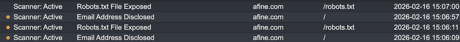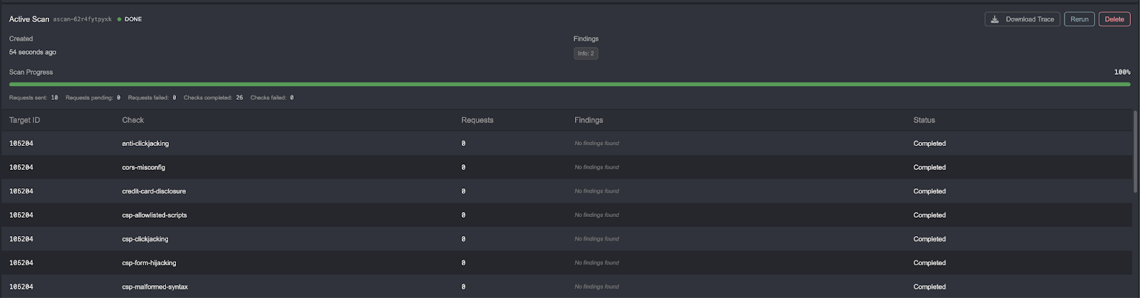 Discovered vulnerabilities are sent by the scanner to a separate Findings tab, which does not contain much detail. Below is an example of a specific potential security finding.