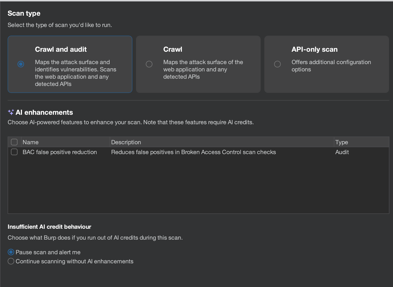 Burp's scanner offers three modes: Crawl and Audit, Crawl, and API-only scan. You can read more about the full scanner configuration in Burp's official documentation.