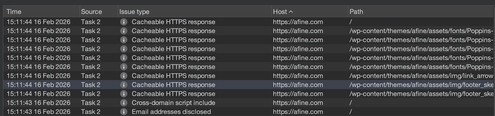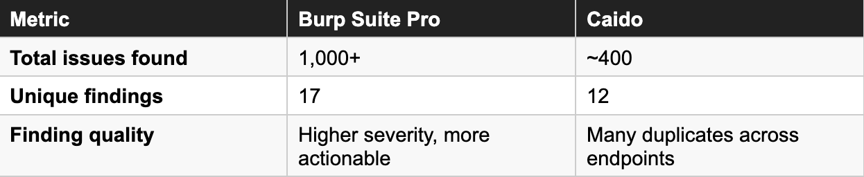 Caido's scanner is far less advanced than Burp's. In penetration testing against the same target, it found only around 400 security issues (the majority of which were repeated across different endpoints), with just 12 unique findings.