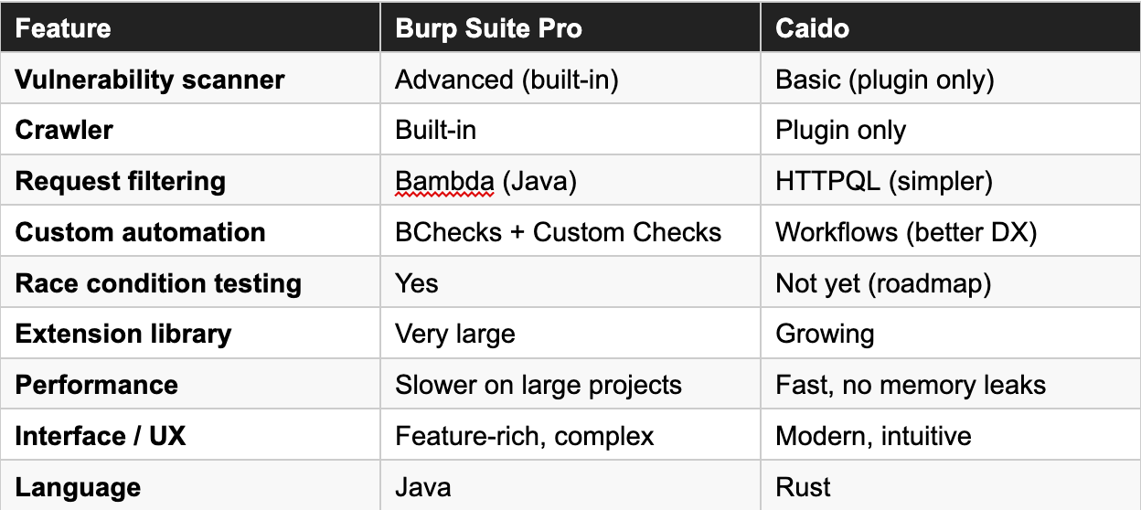 Caido is written in Rust and focuses on speed and better workflow support, especially for Bug Bounty programs. Choosing Burp Professional, on the other hand, is about finding the best penetration testing tool available - not necessarily the cheapest one.