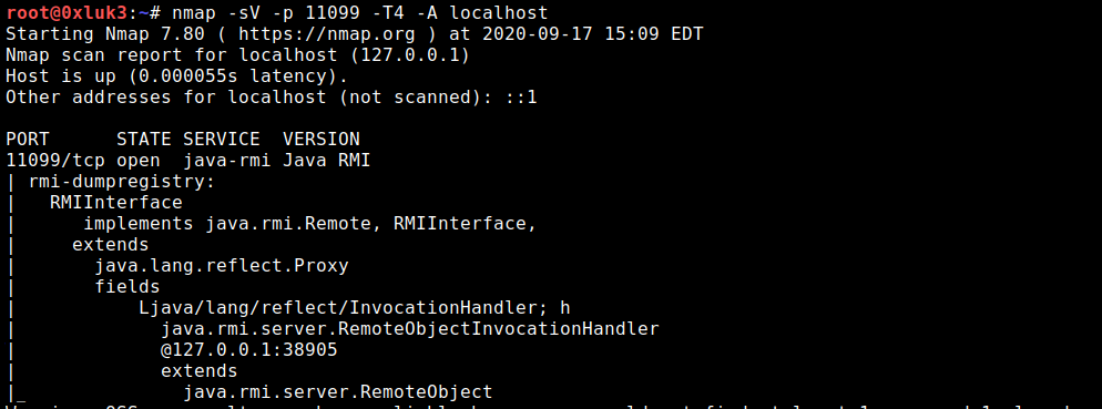 At this point, we can use nmap to scan the localhost interface where the rmi registry and all its bindings are visible: