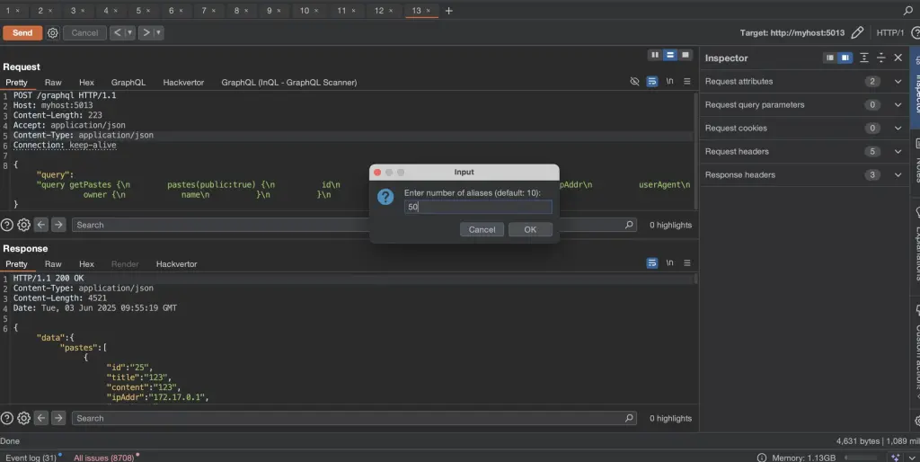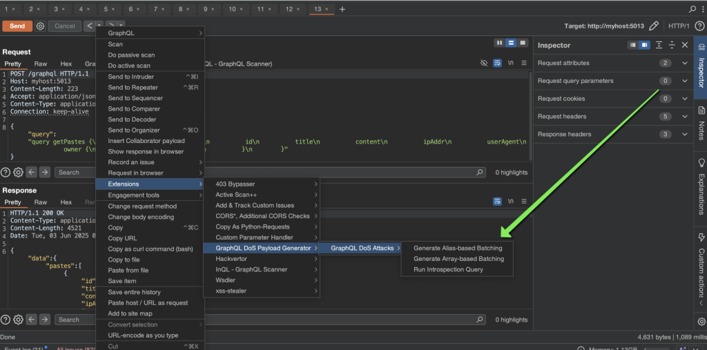 Najprostszym sposobem testowania tego rodzaju podatności jest użycie wtyczki InQL dla Burp Suite. Jednak, jak wspomniałem wcześniej, w momencie pisania tego artykułu funkcja batch attack w InQL nie była jeszcze w pełni dopracowana.