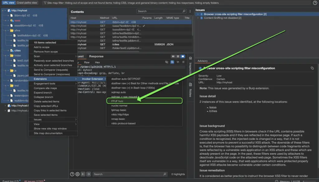 - W zakładce Target zaznacz wiele żądań → kliknij prawym przyciskiem → Invoker → wybierz narzędzie (np. “nuclei normal”).