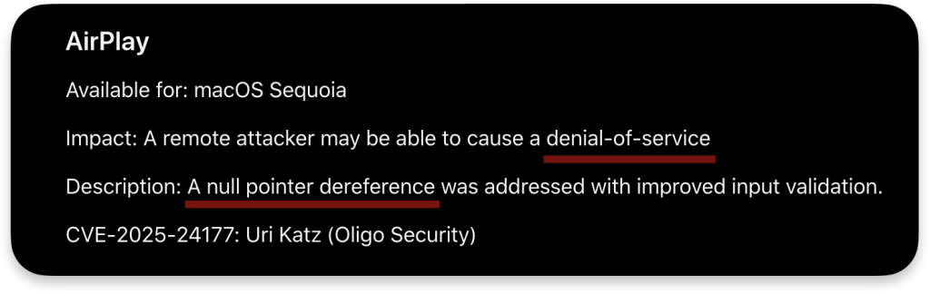 Tak, Apple nadal naprawia tego typu problemy i przyjmuje zgłoszenia na ich temat, ale nie zawsze traktuje je jako luki bezpieczeństwa. Nie wiem dlaczego czasem są one uznawane za problem bezpieczeństwa, a innym razem nie – omówię to dokładniej w kolejnym artykule. Patrząc na najnowsze aktualizacje zabezpieczeń w macOS, można zauważyć, że Apple klasyfikuje poprawki dotyczące dereferencji wskaźnika NULL jako rozwiązania problemów związanych z atakami typu Denial of Service, a nie jako luki umożliwiające wykonanie dowolnego kodu.