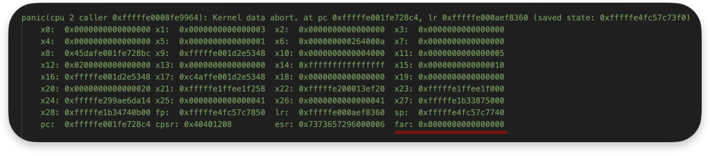 NULL dereference następuje, gdy oprogramowanie próbuje uzyskać dostęp do pamięci pod adresem 0 (adres NULL) poprzez wskaźnik ustawiony na NULL. Na architekturze ARM64 (takiej jak Apple Silicon) adres 0 zazwyczaj nie jest mapowany w pamięci wirtualnej, podobnie jak na innych architekturach. W związku z tym NULL dereference zazwyczaj powoduje błąd dostępu do pamięci. W kontekście jądra systemowego taki błąd prowadzi do natychmiastowej paniki jądra zamiast odczytu lub zapisu prawidłowych danych. Konsekwencją jest awaria systemu (Denial of Service), która występuje po zatrzymaniu przez jądro wykonywania kodu. Takie zachowanie jądra ma na celu ochronę systemu.