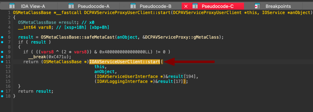 IOAVFamily to klasa sterownika jądra macOS związana z obsługą funkcji audio i wideo. Kod DCPAVServiceProxyUserClient pokazuje, że korzysta ona z interfejsów tej klasy: