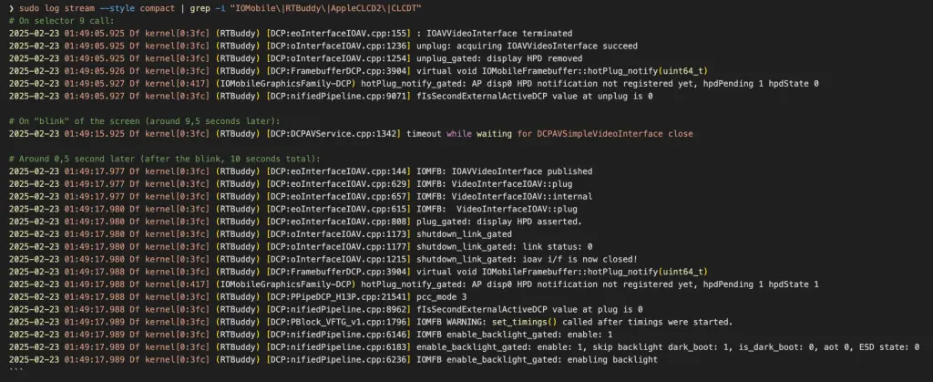 Tym razem było inaczej. Zostawiłem komputer na kilka godzin i nie otrzymałem żadnego powiadomienia o awarii. Po powrocie zastałem czarny ekran, chociaż komputer nie był wyłączony. Początkowo uznałem, że to wygaszacz, ale przypomniałem sobie, że mam go wyłączonego. Ruch myszką ani naciskanie klawiszy nic nie dawały, więc zamknąłem pokrywę MacBooka i ponownie ją otworzyłem. Ku mojemu zdziwieniu pojawił się ekran logowania – bez restartu systemu. Było to dziwne: nie wyglądało to na klasyczny crash, a raczej na problem z wyświetlaniem, który spowodował wygaszenie ekranu i „zamrożenie” systemu. Postanowiłem uruchomić fuzzera ponownie, tym razem celując wyłącznie w sterowniki związane z wyświetlaniem, takie jak AppleJPEGDriver czy DCPAVServiceProxy.