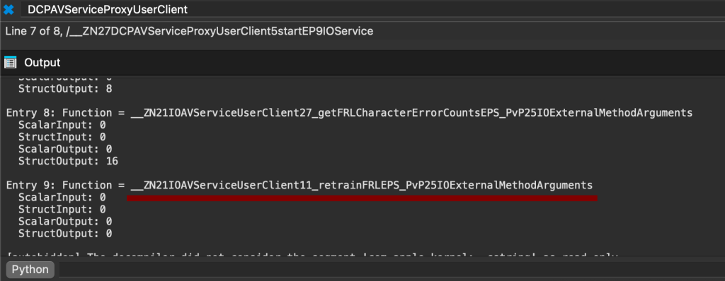 Błąd dotyczy systemów macOS w wersji 15.4.1 (BuildVersion 24E263) działających na sprzęcie Apple M1 Max. Nie udało mi się go odtworzyć na układzie M2, ponieważ DCP występuje wyłącznie w M1. Problem został usunięty w macOS Sequoia 15.6. Luka znajduje się w selektorze numer 9 usługi DCPAVServiceProxy, odpowiedzialnej za obsługę komunikacji z kontrolerem wyświetlacza.