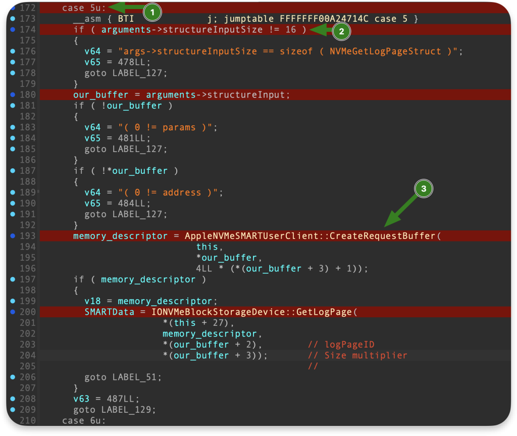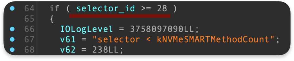 • Główna przyczyna: Obsługa selektora 5 w funkcji AppleNVMeSMARTUserClient::externalMethod;