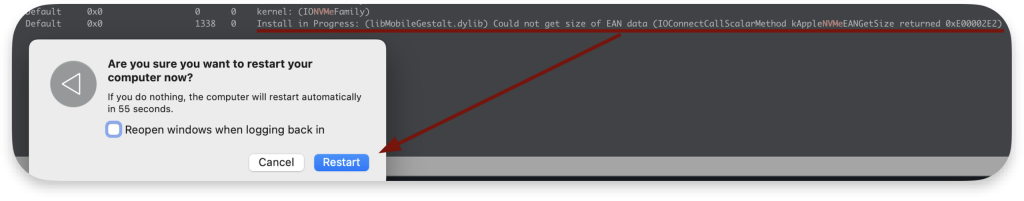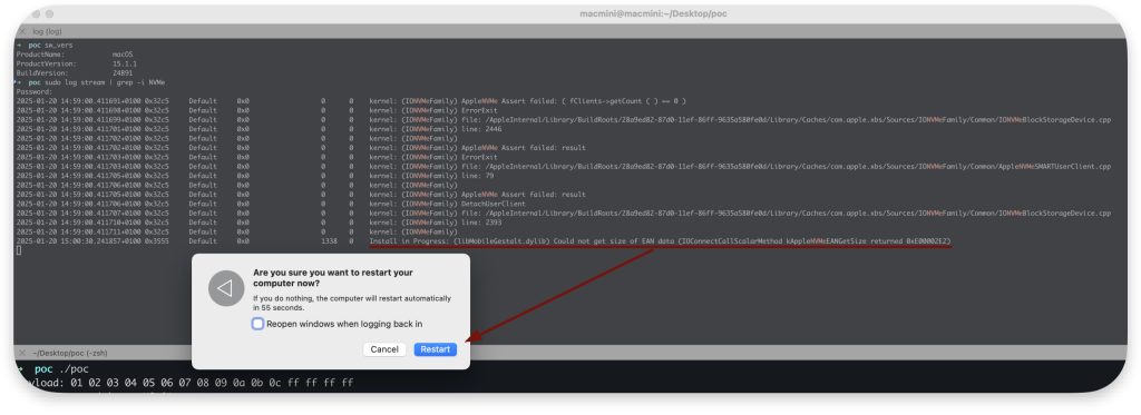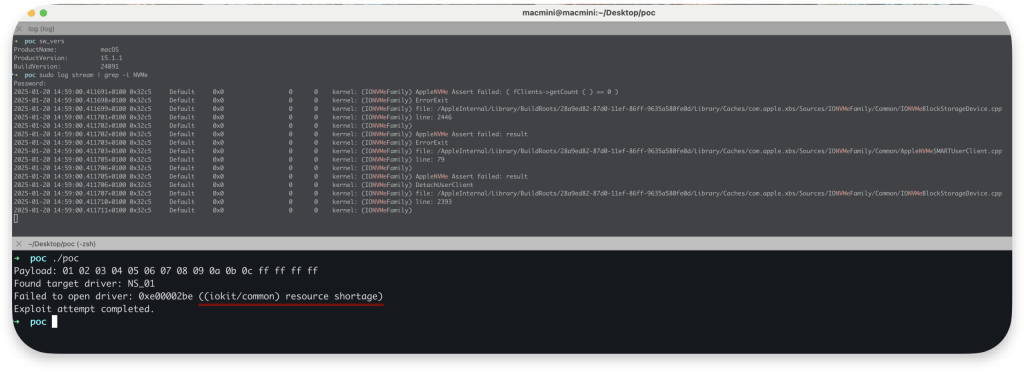 Ostatecznie prowadzi to do wykrycia nieprawidłowej pracy systemu przez watchdog’a podczas ponownego uruchamiania systemu. Co więcej, sterownik jest bezużyteczny do momentu restartu systemu i zwraca błąd: 0xe00002be (iokit/common – brak zasobów) dla wszystkich żądań.