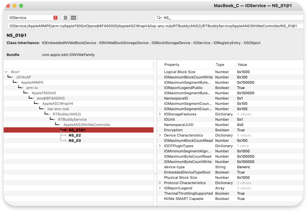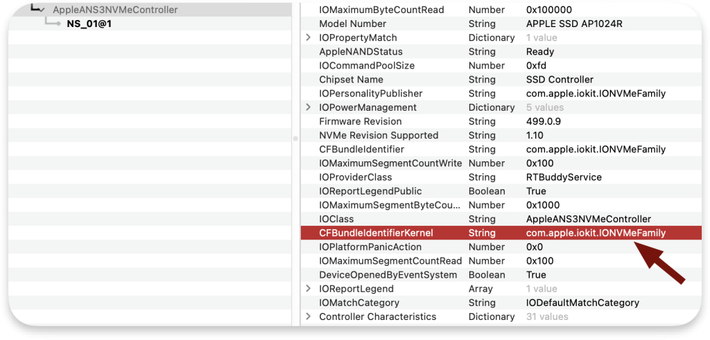 Niestety dla większości sterowników macOS nie ma publicznie dostępnego kodu źródłowego. Z rozwiązaniem przychodzi IDA (narzędzie do debugowania) ale przed jej użyciem musimy wiedzieć od czego należy zacząć. Tak jak pokazano poniżej, NS_01 jest częścią rodziny IONVMeFamily: