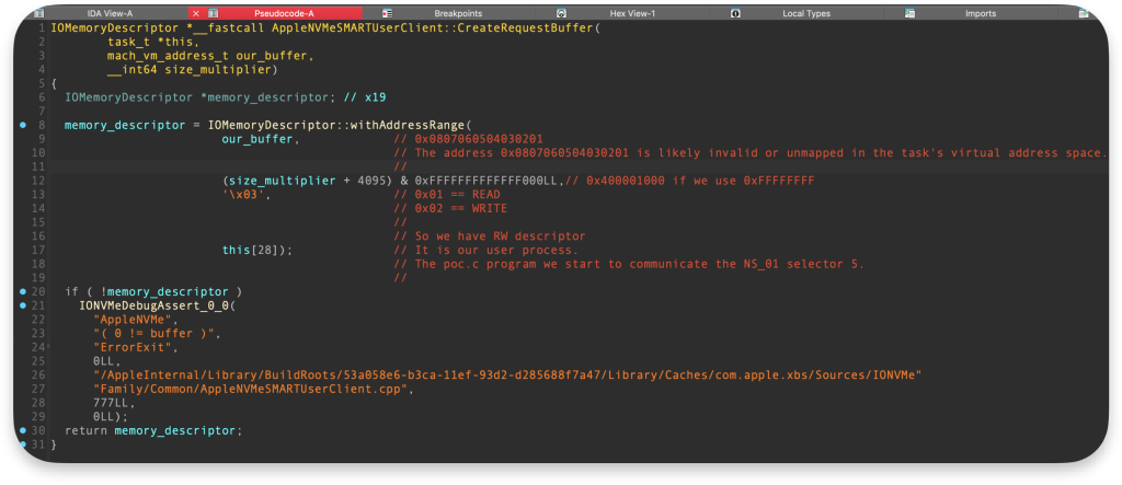 Artykuł przedstawia analizę problemu Denial of Service (DoS), który zidentyfikowałem w tym roku w systemie macOS. Dotyczył sterownika NS_01, będącego częścią rozszerzenia jądra IONVMeFamily.