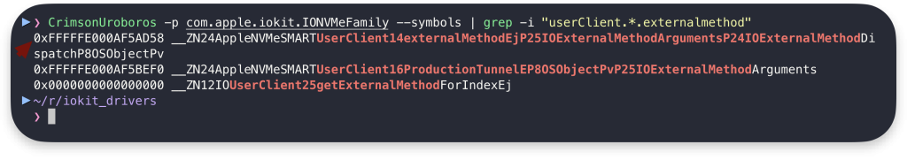CrimsonUroboros -p $(ls kernelcache/System/Volumes/Preboot/*/boot/*/System/Library/Caches/com.apple.kernelcaches/kernelcache.decompressed) --dump_kext com.apple.iokit.IONVMeFamily