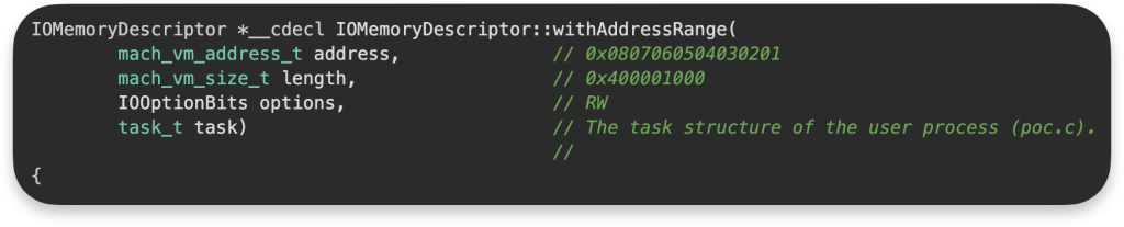 Funkcja IOMemoryDescriptor::withAddressRange tworzy deskryptor pamięci, który opisuje jeden wirtualny zakres w określonym obszarze (memory map), jednak wartość length przekazana jako argument jest niezwykle duża. Jeśli ten deskryptor zostanie później użyty, może to prowadzić do DoS.