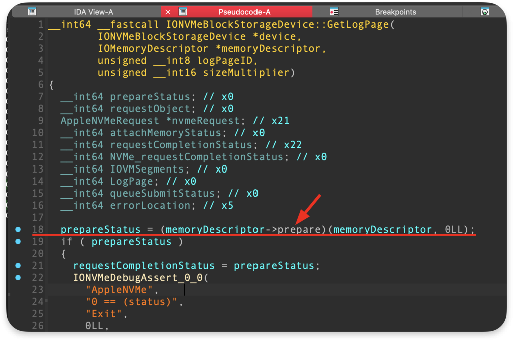 W pierwszej kolejności GetLogPage wykonuje zaznaczoną na poniższym zdjęciu linię kodu wykorzystując nasz deskryptor pamięci: