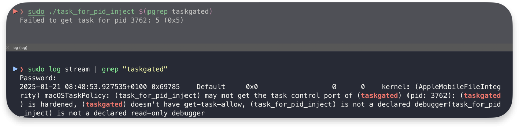 Uzyskanie Task Portu innego procesu jest kontrolowane przez funkcję task_for_pid, która jest zabezpieczona przez taskgated. Sprawdza ona odpowiednie uprawnienia i przywileje użytkownika: