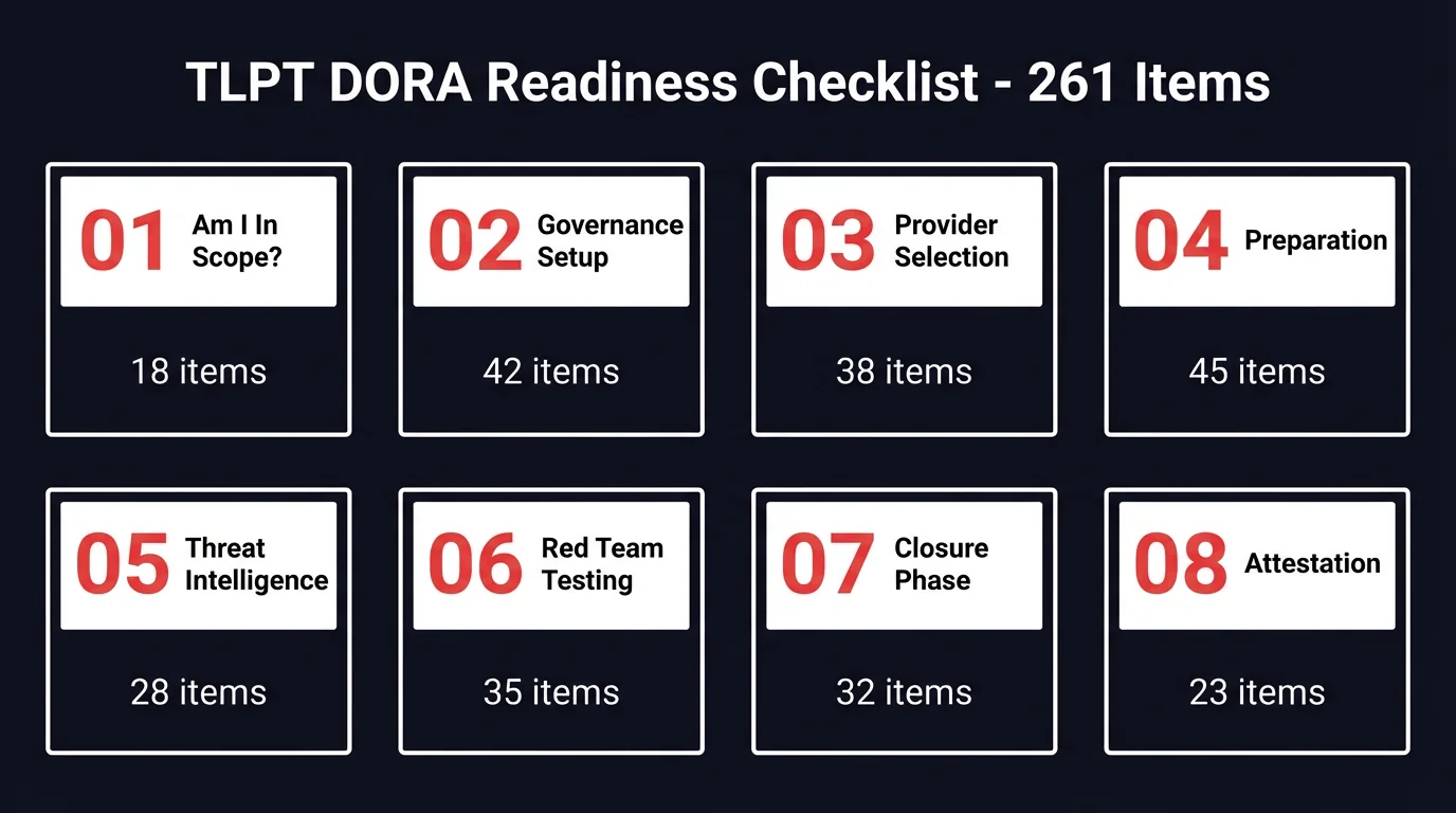 This DORA compliance checklist has 261 operational items across 8 phases of the TLPT lifecycle. Every item traces back to a specific RTS article or TIBER-EU reference. The item tells you what to do, which article requires it, and what the gate is before you move to the next phase.