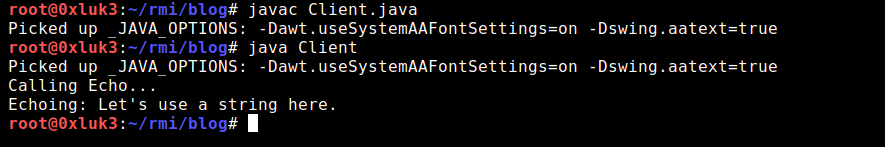 Jeśli uruchomisz taki kod klienta, zostanie on wykonany, a implementacja serwera zostanie uruchomiona. Oznacza to, że do wykonania zdalnych metod wystarczy, że znasz nazwę interfejsu wraz z nazwami metod, typami zwracanych danych i typami argumentów. Dlaczego to jest ważne? Otóż jeśli jesteś w stanie uzyskać informacje o przynajmniej jednej funkcji, która jest obecna po stronie serwera, możesz skonstruować atrapę interfejsu o tej samej nazwie, którą odczytałeś z wyniku skanu nmap, umieścić w niej odpowiednią sygnaturę funkcji (typ zwracanych danych, nazwę i typy argumentów) i utworzyć klienta, który implementuje ten interfejs wraz z atrapą tej funkcji.