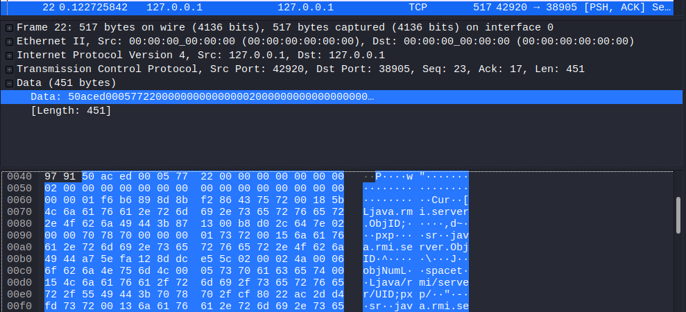 Warto również wspomnieć, że możemy zobaczyć, że dane są wymieniane w formie zserializowanej, co można stwierdzić, patrząc na zserializowane „magiczne bajty” 0xaced0005. Będzie to omówione bardziej szczegółowo w drugiej części artykułu na temat atakowania rejestrów RMI (Spoiler: nowoczesne wersje Javy już zapobiegają takim atakom)